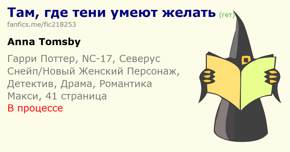 | qaz1211 Спасибо за комментарий! Я думаю, Северус не почувствовал, что его защиту сняли, потому что Люси не пыталась ее пробить, а сняла ее очень долгим и муторным способом, как если бы Северус сам ее снял, но ей пришлось с нуля этот способ искать. Что наверно говорит о ее детективных навыках. А Волдеморт точно появится но позже, ближе к кульминации. | |
